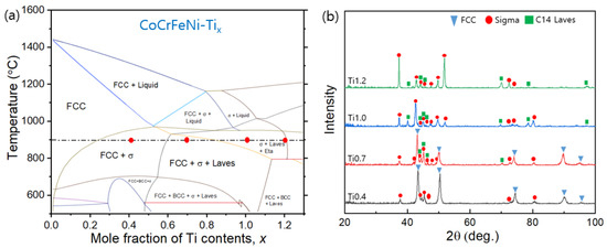 T 1a shows an equilibrium phase diagram of CoCrFeNiTix, where a mole fraction of Ti ranges from 0 to 1.2. According to our prediction based on the CALPHAD method and literature [22], the Co-Cr-Fe-Ni quaternary alloy forms a single phase FCC crystal structure at above 600 °C, while the addition of Ti to Co-Cr-Fe-Ni leads to the formation of a sigma (σ) phase, a Laves phase and an Eta phase. In this system, 55 at.% or higher of Ti is required for Laves phase to appear at 900 °C. XRD profiles of the CoCrFeNiTix alloys (hereafter denoted as Ti-x) presented in Figure 1b show the same results achieved with our CALPHAD prediction. According to Refs. [23,24,25,26], apart from the FCC diffraction peaks, several other diffraction peaks were identified as the σ-phase with a tetragonal crystalline structure and C14 Laves phase with a hexagonal close packed structure, which agrees with the prior works [27]. It is worth mentioning that the peak intensity of the sigma phase increases with the increase in Ti content, indicating the higher volume fraction of the sigma phase in the alloys with higher Ti.