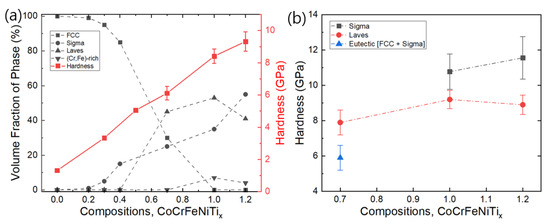 (a) Variations in alloy macro-hardness in accordance with the volume fraction of various phases. (b) Micro-hardness for individual phase for the CoCrFeNiTix alloys. Note that the hardness data for Ti0, Ti0.3 and Ti0.5 in (a) was obtained from the literature [27].