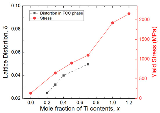 To further understand the correlation between lattice distortion and strengthening effect, we compared the yield strength of the alloys with the lattice distortion as presented in Figure 5. Figure 5 clearly shows that the lattice distortion is in a proportional relation with the yield stress of the alloys, which confirms that the solid solution strengthening induced by lattice distortion has a major effect on the total yield strength of the CoCrFeNiTix HEAs where x < 0.7 [29]. Overall, the present analytical method can be applied to investigate the lattice distortion effect on multi-principal element alloys with random solid solutions from the experimental perspective.