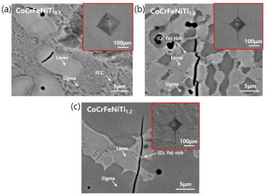 To characterize the fracture behavior of our alloys, we carried out indentation fracture tests on the CoCrFeNiTix (x = 0.7, 1.0, and 1.2) alloy specimens. Figure 6 shows SEM images of the cracks that emerged from the edge of the indentation with a load of 98 N. From the indentation fracture toughness Equation (1) and the inset images of Figure 6a–c, we can obtain the indentation fracture toughness K = 4.14 ± 0.58 for Ti1.0 with H ~8.4 GPa, E ~215 GPa, l ~97 ± 35 μm, and K = 2.79 ± 0.37 for Ti1.2 with H ~9.3 GPa, E ~232 GPa, l ~232 ± 75 μm. For the case of the Ti0.7 alloy (See Figure 6a), after indentation, the cracks nucleated in the Laves phase; however, they were instantly arrested by the surrounding eutectic regions, which were already proven to be softer regions than the Laves phase according to the micro-hardness experiment result in Figure 3b. Therefore, since the crack propagation is suppressed, indentation fracture toughness for Ti0.7 was not determined in this study. Here, it is worth noting that measuring indentation fracture toughness is generally unsuitable for ductile or semi-ductile materials such as Ti0.7, and such a method should be limited to hard/brittle materials.