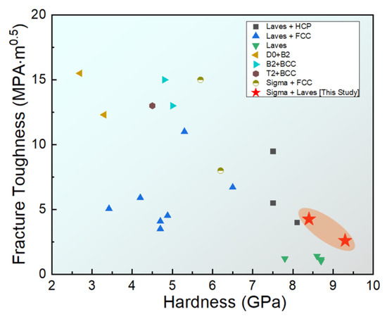 Finally, it is worthy to compare the hardness and fracture toughness of our multi principal element Ti1.0 and Ti1.2 alloys with other intermetallic-phase containing alloys, as shown in Figure 7. Notably, our alloys outperform various metallic composites that contain both intermetallics and solid solutions, due to a balanced combination of superb hardness and good toughness, where hard sigma and Laves phases generally enhance strength while the relatively soft (Cr,Fe)-rich phase improves crack resistance. Indeed, this fracture toughness value of our alloys is impressive, at about two or three times the fracture toughness (~1.5) of conventional close-packed intermetallic single phases [33]. This result suggests that the alloys formed by the combination of hard and soft multi phases could lead to a strength–toughness synergy.
