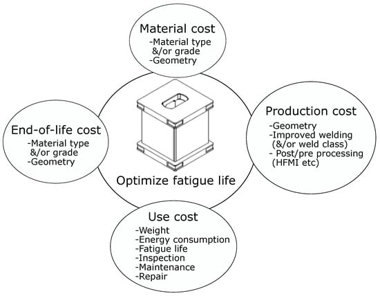 Advances in cost modelling [12,13,14], have shown that there exists an increased interest in introducing cost assessments in an early design stage. However, life-cycle analysis (LCA), and a traditional LCC, is ultimately still performed in a later design stage as it requires extensive material flow knowledge and large databases. Answering to this, recent research has come to highlight the design benefits of adapting a simplified, more generalized, early-stage LCA. In the study by [15], the method of life cycle energy optimization is proposed and shown useful to assess the importance of recycling of lightweight composite materials. In [16], the authors present a material-selection approach that incorporates both structural design and LCA that spans material systems. In the study by [17], LCA-optimization of a concrete precast bridge provides essential design guidance in relation to the found energy-intensive life-cycle stages of manufacture, use and maintenance. Moreover, for steel bridge construction, Ref. [18] finds that simple production cost optimization leads to increased life-cycle cost. This underlines the importance of designing for full life-cycle cost as opposed to that of only production cost. In addition, LCC is often incorporated in work available on maintenance and repair logistics and optimization, such as work by [19,20,21,22]. However, when it comes to LCC coupled to manufacturing variations and fatigue assessment of welded structures, the scientific literature of the field becomes limited. Hence, more research is needed.