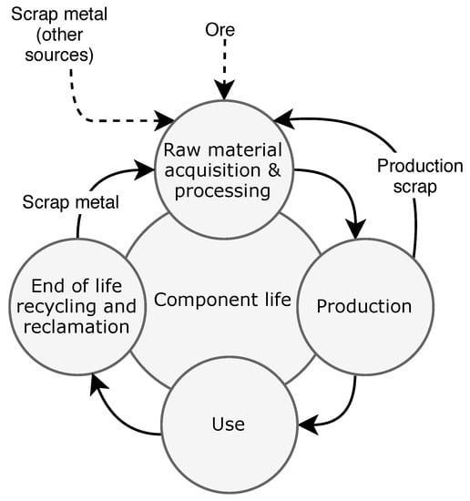 The current study addresses the impact of four life-cycle phases, presented in Figure 2. These phases are raw material acquisition, component production, component use and finally component end-of-life. The life-cycle is considered to be an ideal closed material loop [25], which means that a certain percentage of the entering material is assumed to be recycled to new steel material of the same grade and re-used in a product within the same life-cycle flow. This closed-loop assumption is justified by the fact that steel produced and recycled through an electric arc furnace (EAF) process can be fueled by 100% scrap material [26]. This means that in theory, all scrap material produced during the steel’s life-cycle can be recycled. However, as the quality of EAF produced steel is affected if fed by a scrap steel mix containing to many impurities [27], a retrieval rate of 80% is assumed. The material and production costs of a studied component is estimated using a previously developed predictive technical cost model [12,23], while the use phase and end-of-life phase costs are evaluated separately.