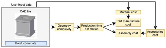 To estimate material and production costs of studied component, a previously developed predictive technical cost model [12,23,28] is applied. The model is developed as a stand-alone package in Python [29] and estimates cost through connecting specified production flow to component geometry and complexity [12,23], see Figure 3. The cost model is modular and the production flow is defined by the user through configuring and combining necessary process steps involved in sought production method. The full cost is calculated as the sum of material costs and costs involved within each production process step. Cost categories considered within the scope of the model are defined in Figure 4. Indirect costs such as R&D development and overhead costs are not included within the scope of this model as their size are highly individual and often not known in an early design stage. For the scope of this paper, some extensions to the model library have been made in order to include that of necessary metallic production, including welding processes.