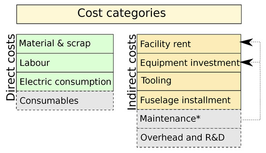 Considered direct and indirect cost categories (drawn in bold line) include material and scrap, labour and power consumption costs. Neglected costs (drawn in dashed line) are overarching costs, such as overhead and R&D, as well as pure consumables (for example basic safety equipment such as gloves, etc). Maintenance costs are not explicitly calculated, but are an implicit part of set equipment utilization and facility costs [28].
