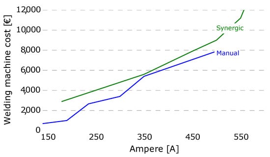 Investment costs of different welding machines [38,39] as a function of highest Ampere output.
