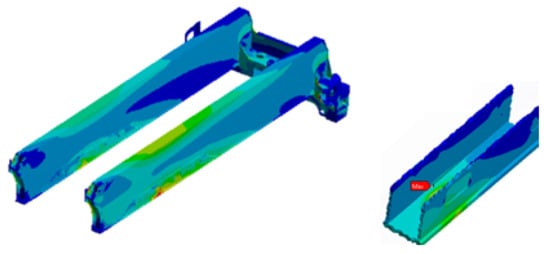 Currently, there are mainly four established methods for fatigue life assessment of welded structures [2,3,4]; nominal stress approach, structural/geometrical “hot-spot” stress approach, effective notch stress approach and linear elastic fracture mechanical crack growth approach. Fatigue resistance of complex welded components based on stress analysis performed with FEA can be assessed in many ways with varying degrees of time consumption and accuracy. A large model will increase both the model preparation and the computational time. Large and complex FEA models may include several critical locations and complex boundary conditions, see example in Figure 7 where the stress value is continually changing at different locations. Nominal stress values are in some of the critical sections difficult or impossible to define. Even if a nominal stress can be defined, one must select from a catalogue of details, the geometry most closely resembling the actual welded detail. In many cases, the actual weld has little similarity to one of the geometries shown in the standards [40,41,42]. A schematic overview over complexity and work effort for different design methods are presented in Figure 8.