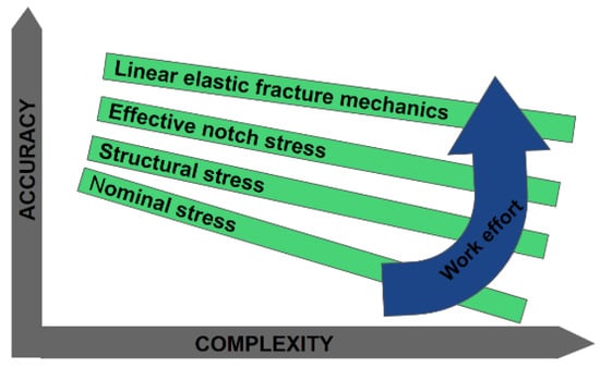Schematic overview accuracy, complexity and work effort associated with the different fatigue assessment methods for welded structures.