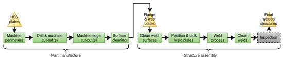 The investigated structure is a representative welded box structure, see Figure 10. The structure is an important member in a spreader. The box structure consists of two flange plates and four web plates [45]. The plates are manufactured from high-strength-structural steel (HSS) where the flange plates are manufactured from S700QL, a quenched and tempered grade, while the web plates are manufactured from S600MC, a hot-rolled structural steel made for cold forming. The structure is assembled through four longitudinal welds and two circumferential bevel welds, see Figure 10. From the perspective of fatigue, the circumferential bevel welds are the critical welds.