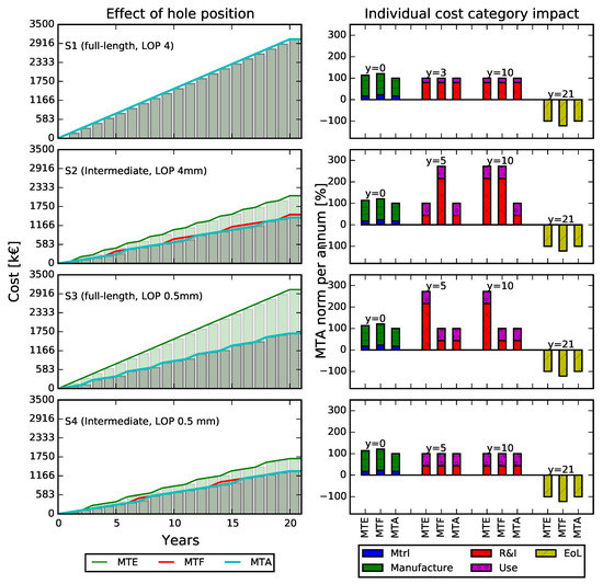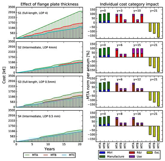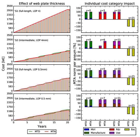 The position of the hole on the flange plates is shown in Figure 15 to have high impact on the fatigue scenarios S2–S4. For the most severe fatigue scenario, S1, we find that all considered cases need annual repairs. The highest impact of eccentricity is shown in fatigue scenario S3, where the life-cycle cost becomes close to 70% higher as opposed to the baseline box. In all fatigue scenarios it is shown that increasing the flange thickness by 10 mm, case MTF, compensates for the hole eccentricity. Thus, in all fatigue scenarios case MTF returns a similar life-cycle cost as that of the baseline box.