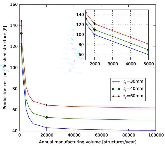 Production cost as a function of annual manufacturing volume for cases mm.