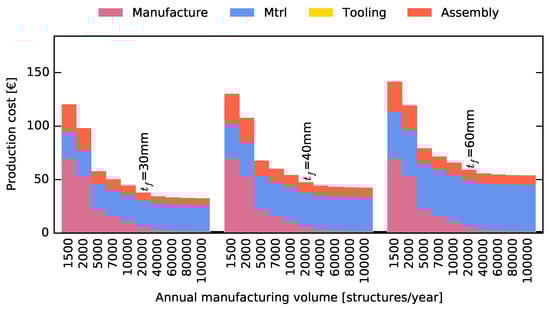 Cost division between manufacture, material and assembly (i.e., welding) costs for different annual manufacturing volumes for the case of mm.