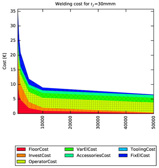 How the cost shifts importance between indirect costs (investments and facility costs) to direct costs (operator, material and direct electricity costs) is similarly shown for the process of assembly, i.e., welding, of the box structure, shown in Figure 18.