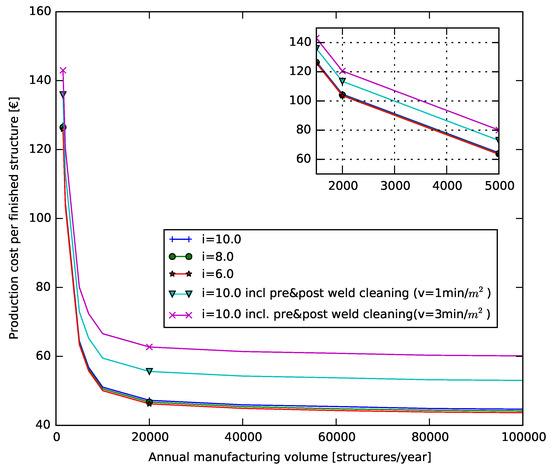 The production costs as a function of annual manufacturing volume of the welded box structure for different penetration depths are given in Figure 19. It is clear that only accounting for different penetration depths, or in fact different bead mass, has little impact on the overall production cost. However, to ensure full penetration depth, the welding process need to be more involved. If considering increased effort through applying pre- and post-weld cleaning and assuming previous hourly labour rates, the cost increases between 16–30% depending on the rate of cleaning, see Figure 19.