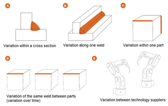 The variation in production can be viewed differently depending on the different stages of the product development stage and role dependent; different roles within the organization needs different information, hence context dependent. In the manufacturing flow, the variation could occur between factories, technology suppliers, batches and within one part. Variation could also be observed within one single weld; along the weld, within the cross section and weld toe geometry. Hence, variation will occur in all product development phases which will have a significant impact on the product quality. Therefore, it is important to identify the sources of variations in the different product development phases in order to minimize their cause. Figure 20 illustrates examples of different sources of variation that could occur in the welding production.