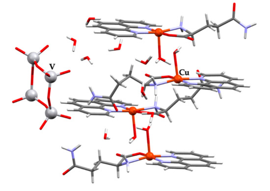 In our search to provide vanadium complexes that mimic the interactions of decavanadates and cyclo-tetravanadates with side-chain groups of proteins with positive or hydrogen-bond donor amino acids, the series of amino acids studied has been expanded to L-glutamine. A new heterobimetallic cyclo-tetravanadate was synthesized and characterized. L-glutamine and phenanthroline mixed copper complex was used to provide potential hydrogen bonds to anchor the complexes of planar di-imines, which are well known to interact with DNA and RNA test molecules [109,110,111]. Compound 1 crystallizes in the non-centrosymmetric space group P1. Interestingly L-glutamine is present in two conformations, where two of the copper complexes show a syn-conformation, while the other two show an anti-conformation.