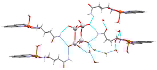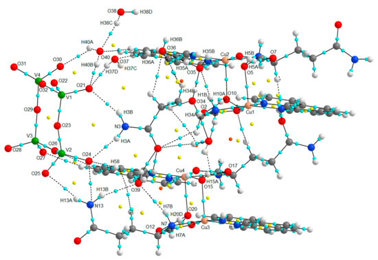 The electron charge transfer process can be analyzed in terms of chemical potential (μ) (or electronegativity (χ = −μ)), hardness (η) (or softness (s = η−1)), and electrophilicity (ω). The results show that the chemical potential value, μ, of Compound 1, indicates the capacity for exchanging electrons. The chemical hardness value, η, indicates the resistance for changing its electron distribution. On the other hand, the behavior of the electrophile or nucleophile can be related to a higher or lower ω index. In conjunction with the MEP analysis, global reactivity indexes give insights regarding the electrophilic or nucleophilic power of the compounds’ sites, which is important for analyzing the interaction. Topological parameters were used to characterize intramolecular interactions, such as electron density , Laplacian , Lagrangian kinetic energy G, potential energy density V, Hamiltonian kinetic energy H, interaction energy EH…Y, and interatomic distance . Results are shown in Table S6. The positive values of confirm the hydrogen bond behavior of the interactions, and the positive values of H(r) indicate hydrogen bonds of a purely electrostatic nature. The value of equation determines the molecular interaction regions, and interaction energy is calculated from equation . The molecular graph for Compound 1 is shown in Figure 6. Cyan dots represent the bond critical points (BCPs), yellow dots represent the ring critical points (RCPs), and orange dots represent the cage critical points (CCPs). In Figure 6, the main H-bond interactions between O atoms of the cyclo-tetravanadate anion with water molecules and H-atoms of glutamine are shown. Table S6 presents the values for H-bonds larger than 0.0100 a.u. The maxima were found for the intermolecular O12⋯H20D, O17⋯H15A, O7⋯H5A, and O2⋯H10A, corresponding to the interactions between one of the H-atoms of the water in the apical position of Cu with the O atom of the −COO− moiety of glutamine, see Figure 6. Their EH…Y values between 5.40−6.93 kcal mol−1 indicate the most stabilized interactions. In addition, the interactions O36⋯H35A, O35⋯H34B, and O40⋯H38C between water molecules have high values of with EH…Y values between 5.71−6.59 kcal mol−1. It can be seen that a lot of RCPs are present, indicating the formation of rings and CCPs forming cage structures between glutamine and phenanthroline molecules, providing structural stability to the molecular structure of Compound 1. Regarding interactions O−Cu, four equivalent interactions between Cu and O atoms of water in apical position can be observed. These interactions (O5−Cu1, O10−Cu2, O15−Cu3 and O20−Cu4) have interaction energy values between 13.02−16.44 kcal mol−1. Similar behavior in the non-covalent interactions between Cu with amino acid was observed for the cyclo-tetravanadate complex [Cu(Lys)(phen)]2[V4O12] containing lysine and phenanthroline, specifically the Cu-N and Cu-O interactions [83].