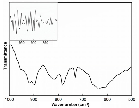 FTIR spectrum of Compound 1 in the 500–1000 cm−1 region. The inset shows the second derivative spectrum in the region 800–1000 cm−1.