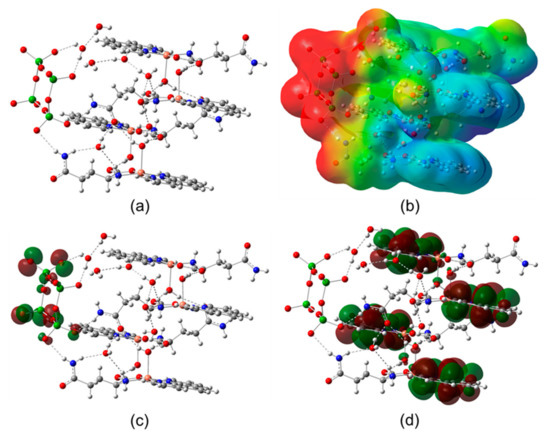 The MEP distribution of Compound 1 shows the total electronic density mapped with the electrostatic potential using an isovalue of 0.004 a.u., in a range of −0.25 to 0.25 e a.u.−3. The red region indicates the negative charge density on cyclo-tetravanadate anion (nucleophilic zone), while the positive charge is mainly located on glutamine and phenanthroline molecules (electrophilic zones). The non-covalent H-bonds between cyclo-tetravanadate and organic counterions and water molecules are located in intermediate regions of electron density (yellow–green regions) (see Figure 5b). Compound 1 shows the isosurfaces of the frontier molecular orbitals (FMO) using an isovalue of 0.03 a.u. (Figure 5c,d), showing significant contributions of phenanthroline and glutamine ligands for HOMO (−4.87 eV) and LUMO (−2.64 eV).