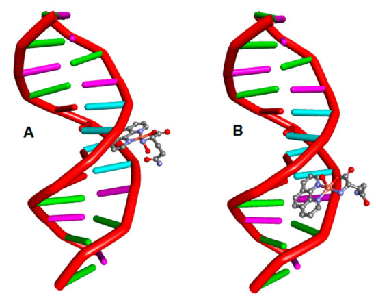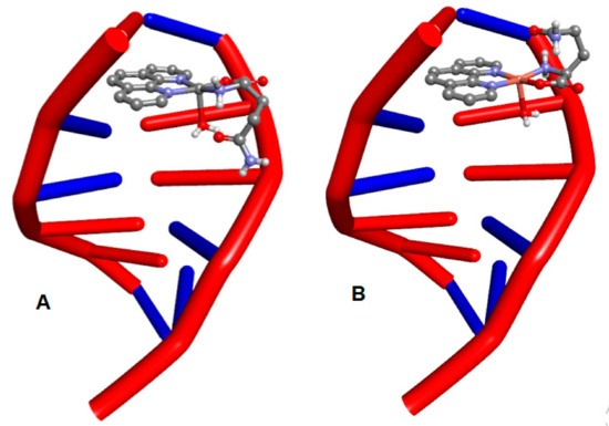 Docked structures of top molecular pose for: (A) anti-[Cu(L-Gln)(phen)(H2O]-1BNA and (B) syn-[Cu(L-Gln)(phen)(H2O]-1BNA.
