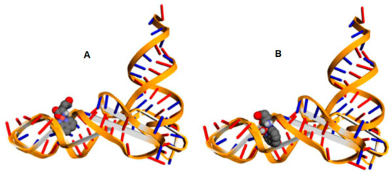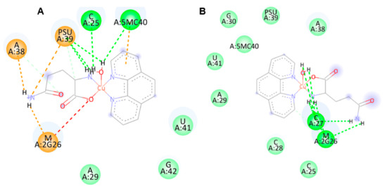 In Table 4, the docked binding energies and the interaction with DNA/RNA corresponding to the top molecular pose (lowest energy) for complex ions [Cu(L-Gln)(phen)(H2O)]+ are shown. As was expected from previous studies, all docked structures occupy similar positions in the minor groove of the 1BNA/DNA and intercalate in the 151D/DNA fragment structures (Figure 7 and Figure 8). The compounds interact well with the DNA test molecules, yet considering the binding energies among these complexes, the best affinity energy is found in the complex ion anti-[Cu(L-Gln)(phen)(H2O)]+. Also, it can be implied that ligand phenanthroline has an essential role in the interaction; this result agrees with our previous results [83,84,86]. Regarding the interaction with an RNA test molecule (Figure 9), the hydrogen bonds between L-syn and tRNA involve C24, C40, and PSU39 (pseudouridine). Salt bridge interactions involve A38 and G26 and the van der Waals interactions include A29, G42, and U41. On the other hand, L-anti interactions consist of hydrogen bonds with C27 and G26 and van der Waals interactions with C25, C28, A29, U41, G30, PSU39, A38, and 5MC40 (5-methyl-cytosine).