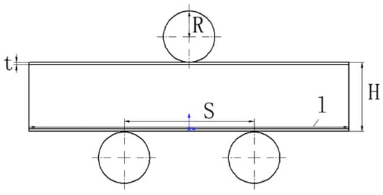 Pure aluminum foam with closed cells was selected to be the core foam material for the aluminum foam sandwiches. They included 3 different densities, which are listed in Table 1. In this paper, “low-density samples” refers to samples with the core of 0.3 g/cm3 and 0.4 g/cm3, and “high-density samples” refers to samples with the core of 0.6 g/cm3, respectively. Additionally, 1 mm thick aluminum alloy 5056 was used as the surface face material. Aerial glue coat was used as the joining glue. The sandwich panels are made using the hot press method at 90 °C for 10 min to join the face sheets and the core. The thickness of the core, c, the thickness of the skin, t, the length, a, width, b, the thickness of the aluminum foam sandwich, c, and the distance between the lower rolls, S, are shown in Figure 1 and Table 2.