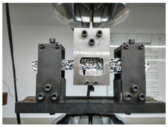 Three-point bending fatigue tests were carried out on the aluminum foam sandwich samples using an MTS-809 fatigue test machine with self-made fixtures (span length = 200 mm), as shown in Figure 2, according to the ASTM C393 standard []. The aluminum foam sandwich samples were tested at loading ratios of R = −0.1 and a cycle frequency of C = 7 Hz. A digital camera was used to record the fracture process. The criterion for the end of the fatigue test was that the sample had visibly broken or the strain (deflection/thickness) was over 20%. Every kind of aluminum foam sandwich of the different densities of core material was tested in at least 4 different loading force experiments. The failure modes were limited to face fatigue and core shear.