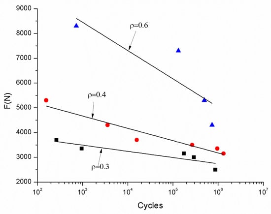 The fitting curves are linear in logarithmic coordinates. Harte [] investigated the use of the fitting formula of the force cycle curves to predict the fatigue limit in certain cycles and to characterize the effects of different parameters. Generally, the fitting curves with cores of 0.3 and 0.4 g/cm3 density have a similar shape and fatigue life limit. However, curves with cores of 0.6 g/cm3 density have more drastic changes and much longer fatigue life. In order to obtain the exact fatigue life limit, the force cycle curves were fitted to achieve the experimental formulae (ρ = 0.3 (3), 0.4 (4), 0.6 (5) g/cm3):