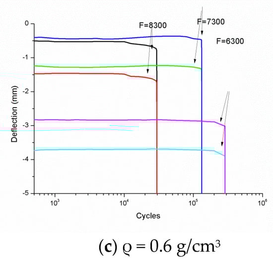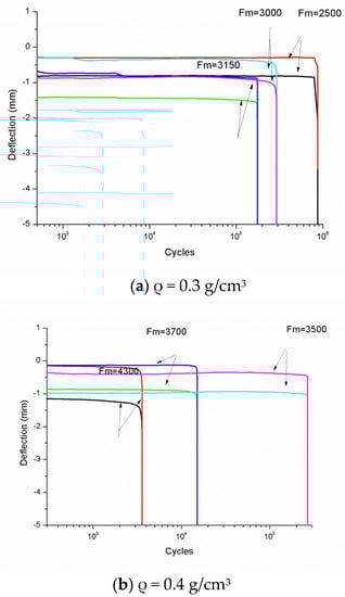 In order to describe the mechanical behavior changes in the aluminum foam sandwich panels in the three-point bending fatigue test in depth, the deflection of the aluminum foam sandwich with foam cores of different densities was recorded at various force levels and was changed according to the number of cycles during the fatigue experiment. The curves are shown in Figure 4, with Fm representing the peak force in the cycle. In addition, the curves do not include the low cycle fatigue (N < 1000) because of the deflection record on time. When we tested in high frequency, the low cycle fatigue only recorded several dots which either cannot draw the curve, or have big margins of error, so we do not list the low cycle fatigue curves in Figure 4.