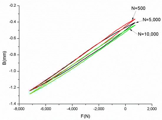 The typical hysteretic curves (ρ = 0.4 g/cm3, R = −0.1, Fm = 3700 N) are shown in Figure 5. In the 100th cycle group, the shape of the hysteresis curve is relatively full (reflecting the strong plastic deformation ability of the specimen at the initial stage), and no obvious shear deformation occurs. As the number of cycles increases, the shape of the hysteresis curve shrinks under the effects of alternating stress, indicating that the sample is affected by the slip inside the core. In addition, as the number of cycles increases, the displacement of the maximum force also rises, indicating that the aluminum foam core has a certain compressibility.