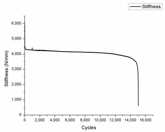 Stiffness–cycles curve (ρ = 0.4 g/cm3, Fm = 3700 N).
