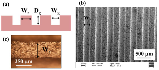 | Surface | Ridge Width (Wr) (µm) | Groove Width (Wg) (µm) | Groove Depth (Dg) (µm) | Width Ratio WR = Wr/Wg |