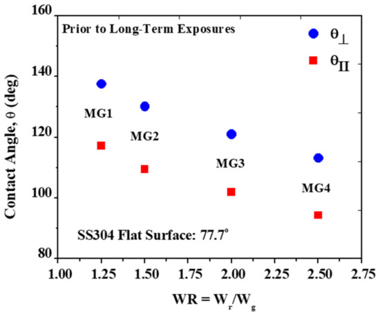 | Surface | Width Ratio WR = Wr/Wg | Contact Angle (°) Prior to Long-Term Exposures | θr (°) | ||||
