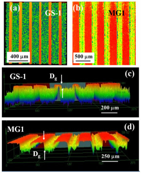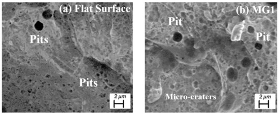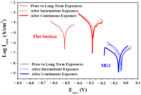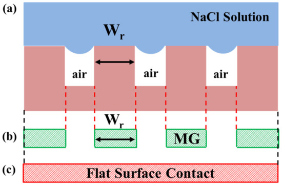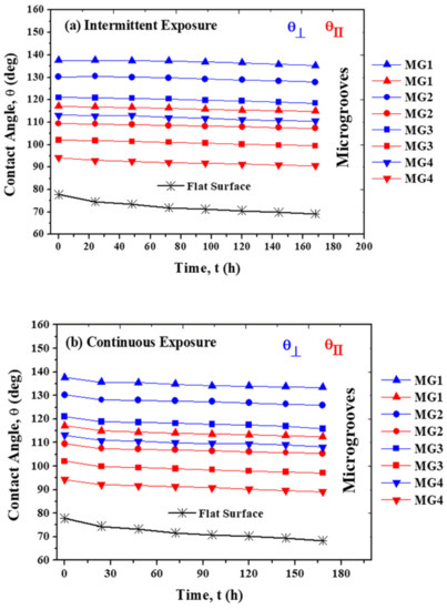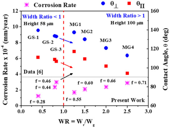 - Absence of complex chemistry and interface in micropatterns. Chemical modification approaches such as coatings, platings and paints create a chemical barrier on surfaces that prevent corrosive fluids from contacting metallic surfaces. In the topographical modification approach, fluids are in contact with metallic surfaces, but the area of contact of surfaces with fluids is greatly reduced. Although chemical modification approaches effectively reduce corrosion, they have several critical issues that can cause loss of anticorrosion performance. These issues need to be considered while formulating the main functionality of protection against corrosion, such as adhesion to surfaces due to the presence of interface, layer thickness, mechanical durability, presence of micro-defects and chemical complexity in coatings [42,43,44]; non-uniform thickness, brittleness and cracking in plating [45]; the presence of volatile organic compounds in paints [44]; and most inhibitors are hazardous and expensive [46]. Micropatterns are environmentally friendly and can be implemented over large surface areas. They can provide corrosion inhibition efficiency (η) similar to that by chemical modification of surfaces. For example, manganese-based thin films (thickness 190 nm) on SS304L when tested in 3.5 wt. % NaCl solution showed η ≈ 96% [47]. MG1 shows η ≥ 92% (Table 5), after long-term exposure to 3.5 wt. % NaCl solution.