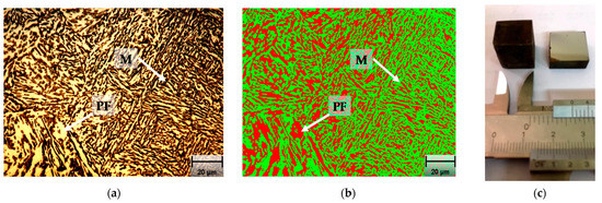 Micrography example showing the quantification procedure by Image-Pro Plus software for the polygonal ferrite (PF) and martensite (M) in S1 sample, annealed to 760 °C and then quenched in water: (a) micrography polished and etched with a 3% Nital solution where the bright color is PF and dark color is M; (b) the same micrography quantified, where PF is red (50 vol.%) and M is green (50 vol.%); (c) cubic sample of 15 mm edge and next cut in half and polished.
