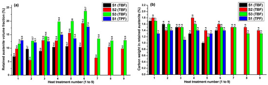 Figure 2 shows the results of the XRD for each of the samples subjected to the different heat treatments established in Table 3. When analyzing the vol.% RA (Figure 2a) it is appreciated that the heat treatment number 6 generates the highest percentages for each one of the steels, except for S1 (TBF), which is also over 10%. On the other hand, when analyzing the wt.% C in the RA (Figure 2b), the heat treatment 6 presents the most homogeneous amounts, ranging from 1.4 to 1.6%.