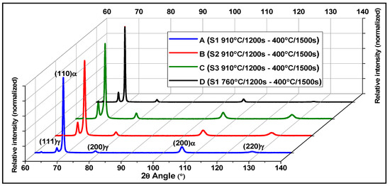 The new designation for the possible TBF steels will be A, B, C, coming from the chemical compositions S1, S2, S3, respectively, with heat treatment route 1. While the new designation for the possible TPF steel will be D, coming from the chemical composition S1, with heat treatment route 2. The diffractograms in Figure 4, graphically show the difference between the steels achieved with heat treatment number 6, regarding to peaks relative intensities of austenite (γ). Table 4 shows a resume with the designations, heat treatment selected and its XRD parameters. Consistent with the increase in wt.% C, steels A, B and C increased the vol.% RA from 10.4 to 23.7%, while steel D achieved 17.9%. The stable wt.% C in the RA, between 1.4–1.6%, will be important to evaluate the capability of transformation by plastic deformation from RA to M and the tensile mechanical properties of the different steels (A, B, C, D) in the same condition.