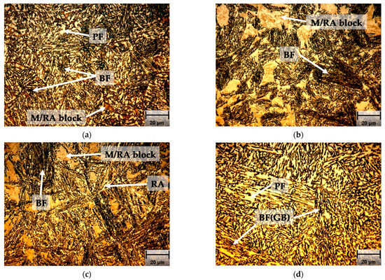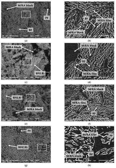 Steel B and C in Figure 6c,e, respectively, show M/RA in blocks and some colonies of well-defined lath-like bainite (LB) by the M/RA film, and in Figure 6d,f, a coarser microstructure is appreciated with well-defined sheaves shape [28], with M/RA film and M/RA block between them. PF is not appreciated in these steels, confirming what was proposed in the OM analysis, regarding with that the “white phases” could correspond to RA in blocks or at least M/RA high in RA.