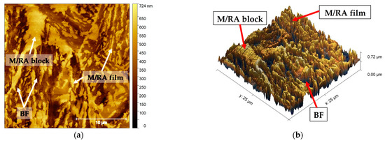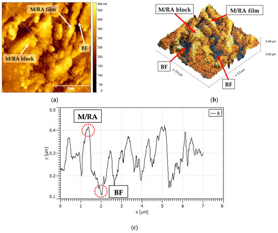 In Figure 8a,b, a topographic image in 2 and 3 dimensions of a smaller area of steel B is shown as an example. Thanks to the higher resolution of the AFM technique, the detail of the bainitic morphology can be appreciated, thus representing a great alternative to explore bainitic steels, better than SEM and TEM. Figure 8c represents a profile of heights taken along Figure 8a, where the valleys are BF, with relative height close to 150 nm, and the peaks M/RA, with relative height close to 400 nm. The width of a BF (LB) is not more than 1 µm, just like M/RA films.