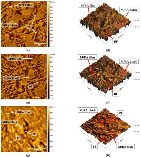 Analyzing only the relative heights, the steels A, B, C (Figure 7a–f) shows a topographic image with similar characteristics, where BF and M/RA (in block and films) can be identified, not appreciating the presence of PF. The morphology of BF is clearly like fine sheaves, characteristic of bainitic steels, however, as the amount of carbon from A to C steels increases, M/RA in block is coarser.