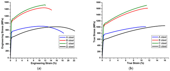 Regarding Ultimate Tensile Strength (UTS), both engineering and true, the trend of increasing resistance is maintained with the increase in the wt.% C, highlighting the B and C steels with a higher comparative value. Remarkable is the behavior of steel D, since the resistance gap with respect to steel A, previously 175 MPa in YS, drops to 16 MPa for engineering UTS and 31 MPa for true UTS.