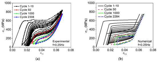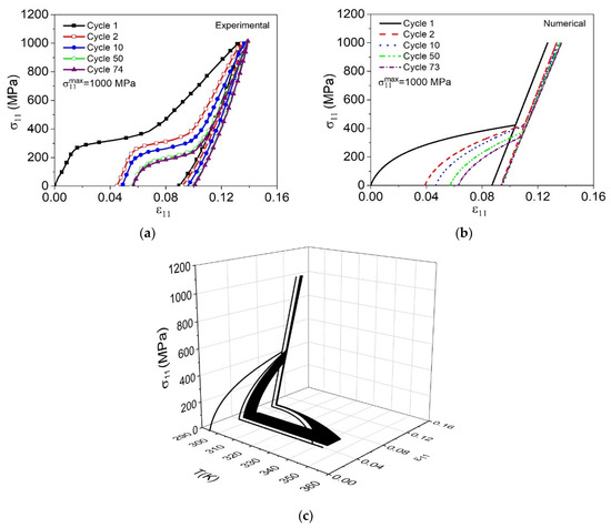 Many engineering applications use SMA devices exploring the one-way shape memory effect, such as in-space deployable antennas and fighter aircraft tube joints [55]. In many of these applications, devices are subjected to cyclic loading and the study of fatigue should be considered. In order to analyze the effects caused by fatigue in SMAs considering SME, the experimental tests proposed by Zhao et al. [18] are used as a reference. NiTi micro-tubes are subjected to a thermomechanical loading process with tensile mechanical loads followed by thermal loads. As-received specimens are adopted and therefore, results are not restricted to stabilized cycles. Parameters presented in Table 6 are employed for the simulations. Figure 19a shows the experimental stress–strain curve obtained for different cycles considering a peak stress of 1000 MPa and a stress rate of 40 MPa/s. For the cyclic thermal loading stage, the minimum and maximum temperatures are set as 295 K and 343 K, respectively. In addition, a linear heating time of 25 s and a linear cooling time of 10 s is used. The numerical-experimental comparison is carried out showing only the mechanical part of the load since the experimental results do not show the thermal part. Figure 19b shows the numerical result for the same test. Figure 19c presents the simulation of stress–strain–temperature evolution over the cycles until failure.