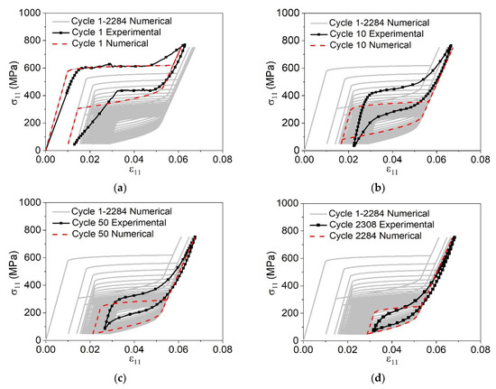 Figure 2 shows the numerical-experimental comparison considering four cycles: 1, 10, 50, the last cycle before failure obtained experimentally (2308), and the last cycle predicted by the model (2284). Note that the transformation induced plasticity and the accumulation of functional and structural damage causes a loss of performance with the increase of the number of cycles. Figure 3 shows the evolution of volume fractions for the same cycles. Observe that the material has 100% of its performance capacity during the first cycle, as shown in Figure 3a, and this percentage progressively decreases due to the evolution of the damage, until reaching approximately 60% in the last cycle before the failure as shown in Figure 3d. In addition, the evolution of TRIP and functional damage inhibit the beginning of the reverse transformation, as observed in Figure 3a,d.