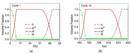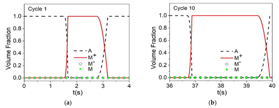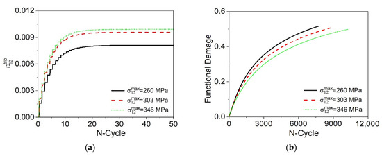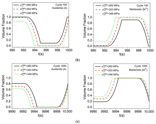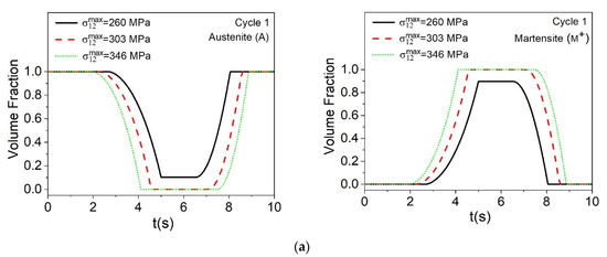 Figure 9 presents the evolution of volume fractions for austenite (A) and detwinned martensite ( M + ). Initially, it is observed in Figure 9a that for σ 12 max = 260 MPa a complete phase transformation does not occur, whereas, for the other two load levels, the material has 100% of its transformation. Figure 9c shows cycle 1000, where it is possible to correlate the maximum shear stress with the loss of functionality due to the evolution of the functional damage. In this regard, by increasing σ 12 max from 260 to 346 MPa, the material exhibits a significant reduction of the volume fractions of approximately 20%.