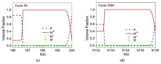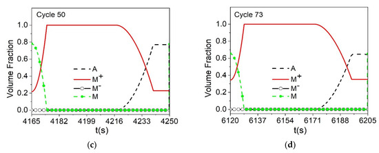 Figure 21. Evolution of volume fractions through different cycles to evaluate functional and structural fatigue. (a) cycle 1; (b) cycle 10; (c) cycle 50; (d) cycle 73.