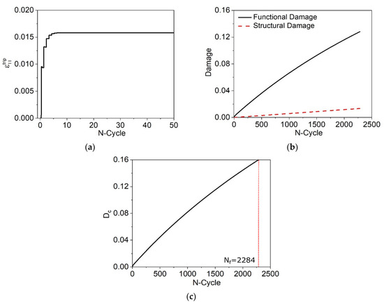 Figure 22. TRIP strain and damage evolution. (a) TRIP evolution; (b) functional and structural damage evolution; (c) D c evolution.