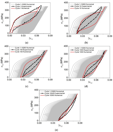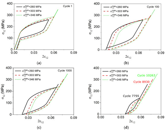 After the numerical-experimental comparison, numerical simulations are carried out considering three different loads in order to verify the influence of maximum shear stress, σ 12 max , on the fatigue life of the material. The maximum shear stress employed by Predki et al. [17] during loading-unloading torsion experiments is used as a reference. Figure 8 shows the stress–strain curves for different cycles: 1, 100, 1000, and the last cycles predicted by the model. The increase of the maximum applied stress causes an increase of the maximum strain (maximum strain value during the loading process) and the residual strain (strain observed after the finish of the loading process). In addition, there is a progressive reduction of the area of the hysteresis loop due to the evolution of functional and structural damage, similar to the axial load cases.
