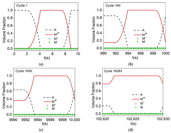 Figure 6 shows the numerical-experimental comparison considering different cycles: 1, 10, 100, 1000, 10,549 (last cycle before failure obtained experimentally) and 10,263 (last cycle predicted by the model). In general, a progressive decrease of the functional properties of the material can be observed during torsional fatigue tests in a similar way as presented in the tensile fatigue tests. Figure 7 shows the evolution of volume fractions considering cycles 1, 100, 1000, and 10,263. Damage evolution promotes a reduction of the phase transformation capacity, causing the loss of functionality, as can be seen by comparing cycle 1 (Figure 7a) with cycle 10,263 (Figure 7d), where the material loses approximately 80% of its phase transformation capacity.