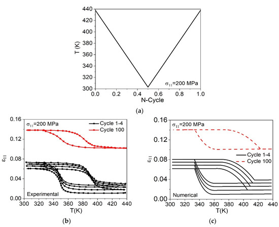 Functional and structural fatigue due to thermal loadings is now of concern. Initially, a numerical-experimental comparison was conducted to obtain the mechanical properties of the material. On this basis, experimental tests proposed by Xu et al. [53] considering 100 thermal cycles at a constant stress of 200 MPa, were used as a reference. A NiTi wire initially in the austenitic phase at a temperature of 438 K was cooled to 303 K. During the cooling process, an austenite–martensite phase transformation was observed. By heating the sample, an inverse transformation was verified and the sample returns to the initial phase. Table 5 presents model parameters employed for numerical simulations together with critical damage parameters presented in Section 3.2. The thermal loading process is illustrated in Figure 11a. Figure 11b shows the experimental strain–temperature curves performed by Xu et al. [53] for cycles 1–4 and 100, while Figure 11c shows the numerical results for the same cycles. Figure 12 shows the numerical-experimental comparison for cycles 1 and 100 of the test. A good agreement between the results is observed, showing the model’s capability to represent the general behavior of the material.