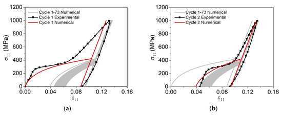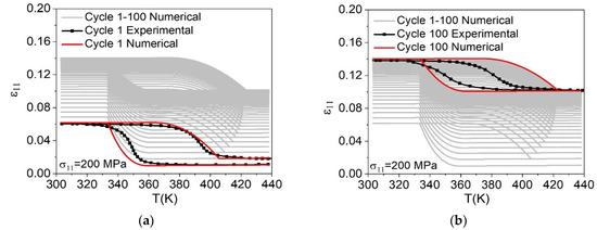 Figure 12. Thermal cyclic test, under a constant uniaxial load, based on experimental tests developed by Xu et al. [53]. Numerical-experimental comparative results for different cycles: (a) cycle 1; (b) cycle 100.